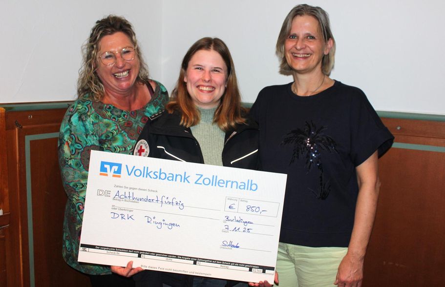 Unsere Einnahmen aus der Afterwork-Party im Sommer 2025 spendeten wir an das Deutsche Rote Kreuz. Unsere Vorsitzenden Susanne Ruf und Sabine Hauko übergaben den Scheck in Höhe von 850 € in der letzten Vorstands-sitzung an die DRK-Bereitschaftsleiterin Lina Bade (in der Mitte).